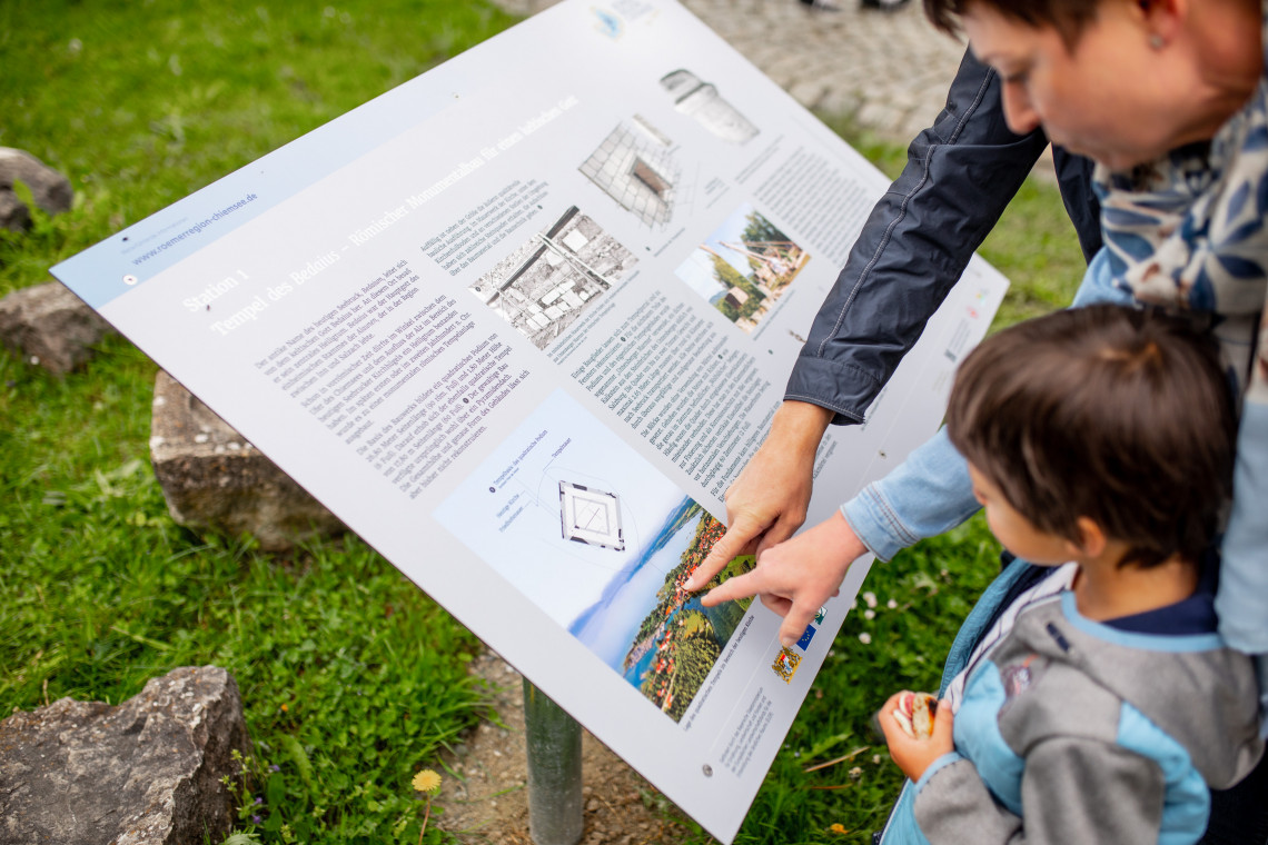 Auf dem heutigen Vorplatz des Museums BEDAIUM sind römische Spolien, d. h. ältere Architekturteile die für jüngere Bauten wiederverwendet wurden, aufgestellt. Das Baumaterial für Steinbauten oder Steindenkmäler (Grabsteine, Weihealtäre, etc.) stammte in BEDAIUM zumeist vom Untersberg (Veitlbruch bei Grödig) oder aus dem Tauerngebirge. Zudem können 9 Meter der rekonstruierten Kastellmauer besichtigt werden. An der Station 1 finden sich ansprechende Schautafeln über den Bedaius-Tempel und das Spätantike Kastell von BEDAIUM. Das Römermuseum nebenan lädt ein den Ausflug in die Antike zu vertiefen. Es zeigt einen umfangreichen Überblick über die früh- und mittelkaiserzeitliche Siedlung mit sehr gut erhaltener Terra Sigillata und allen Dingen die zu einem „Römerleben“ gehörten. Auch die Waffenfunde aus der Zeit des Untergangs der Siedlung in der Mitte des dritten Jahrhunderts werden ausgestellt.